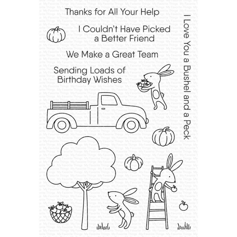 Autumn portends a harvest of good times with friends and family and an abundance of fall-themed delights. This set features a bunch of cute bunnies to pick a bounty of apples and pumpkins. Load up the classic old pickup to haul them to their destination and add one of the included sentiments to send love, birthday wishes, and gratitude.