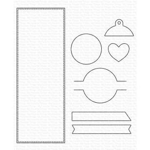 So you’re ready to bring some added flexibility to your slimline design options? You’re going to love this assortment of classic elements that will greatly expand the possibility of these modern proportions. The large stitched panel will layer beautifully over that featured in the original Slimline Starter Die-namics, leaving a 1/4” margin around the perimeter. Alternatively, use the circular notch die to create a pocket/label that the stitched panel can slide behind. Accent the notched area with the circle, heart, and sentiment strip elements or create a tag with the topper element. Just imagine all the mix-and-match opportunities this selection of dies provides!